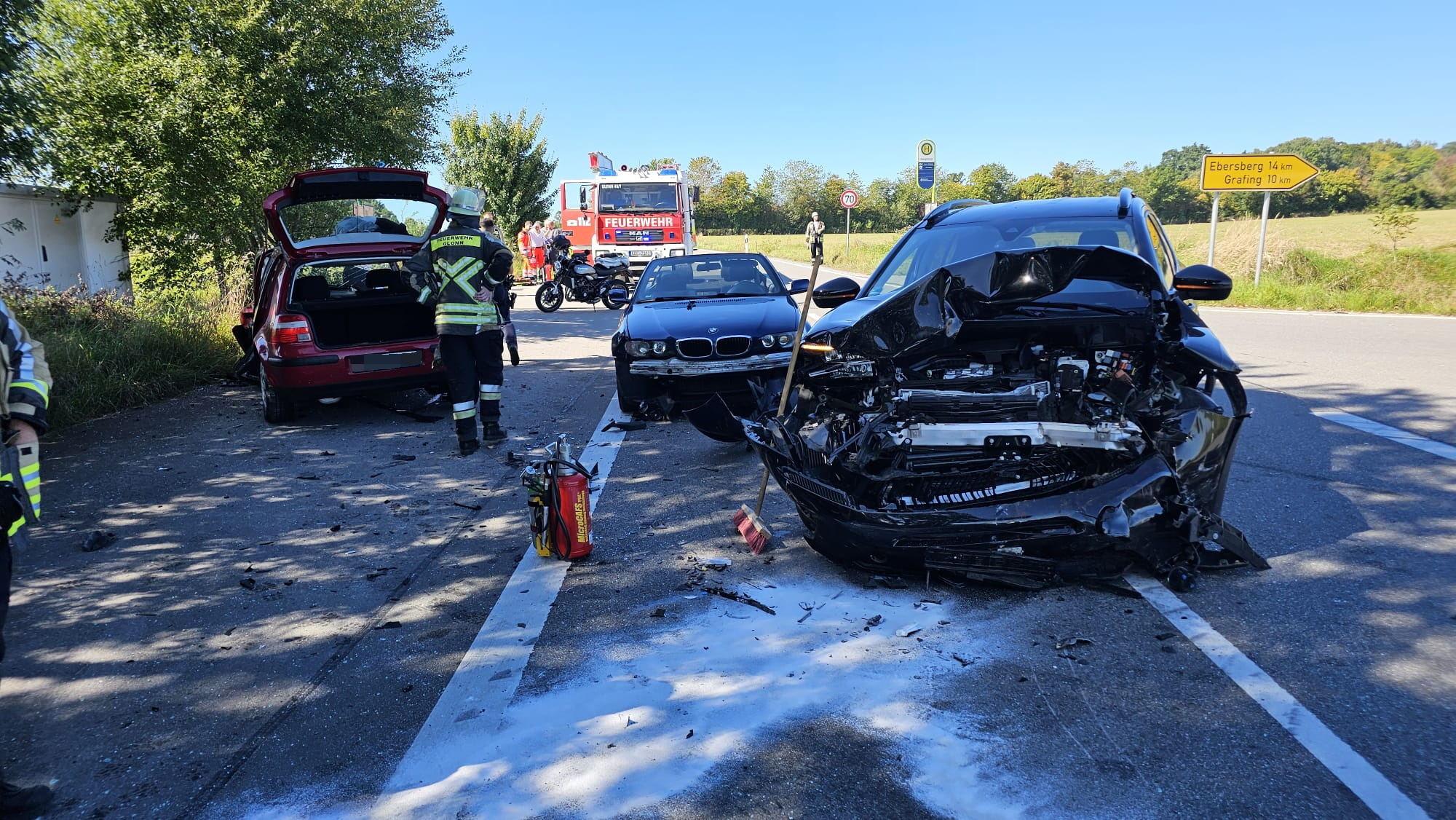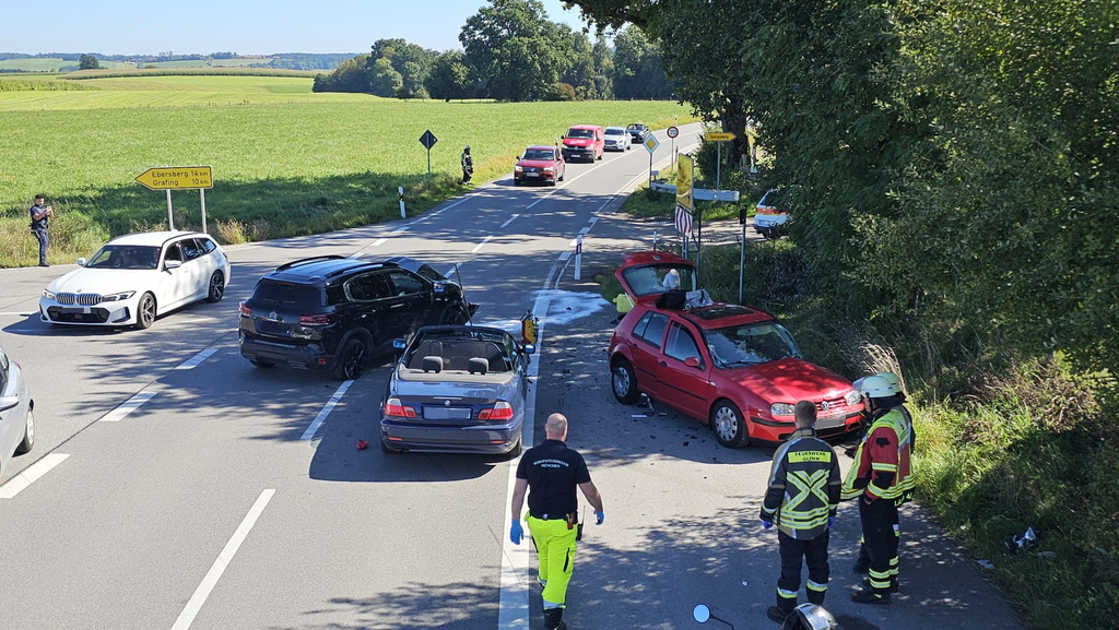 Am Vormittag kam es auf der Staatsstraße zwischen Glonn und Berganger zu einem Verkehrsunfall mit insgesamt drei beteiligten PKW. Mehrere Personen wurden verletzt: eine Person erlitt mittelschwere Verletzungen, eine weitere befand sich im Schockzustand, zwei Personen wurden leicht verletzt, darunter auch ein Kleinkind.