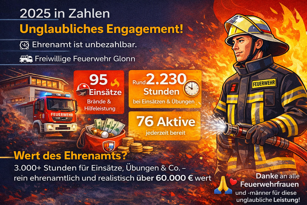 Ein großes Dankeschön an alle Kameradinnen und Kameraden der Feuerwehr Glonn für ihren Einsatz im Jahr 2025 – und an alle Arbeitgeber, Familien und Unterstützer, die dieses Engagement möglich machen.